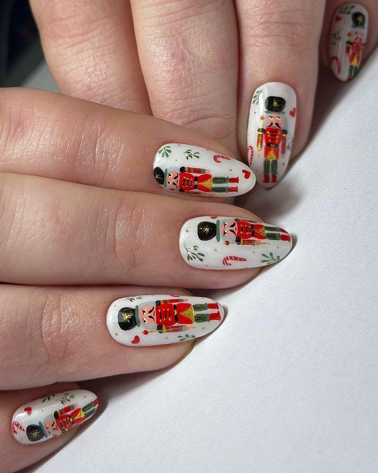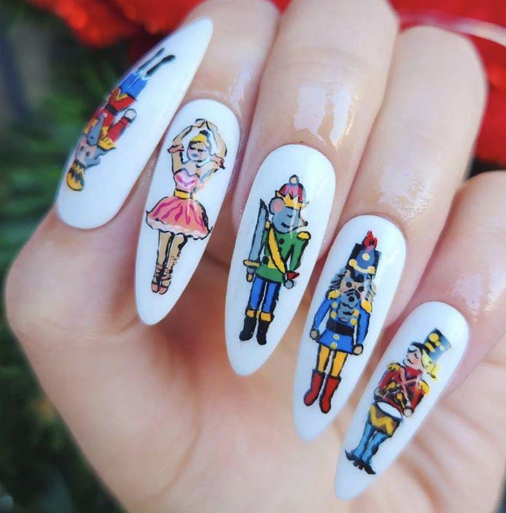 White nails act as a clean canvas for colorful illustrations of ballet characters and soldiers, creating a charming, storybook-inspired Nutcracker theme.