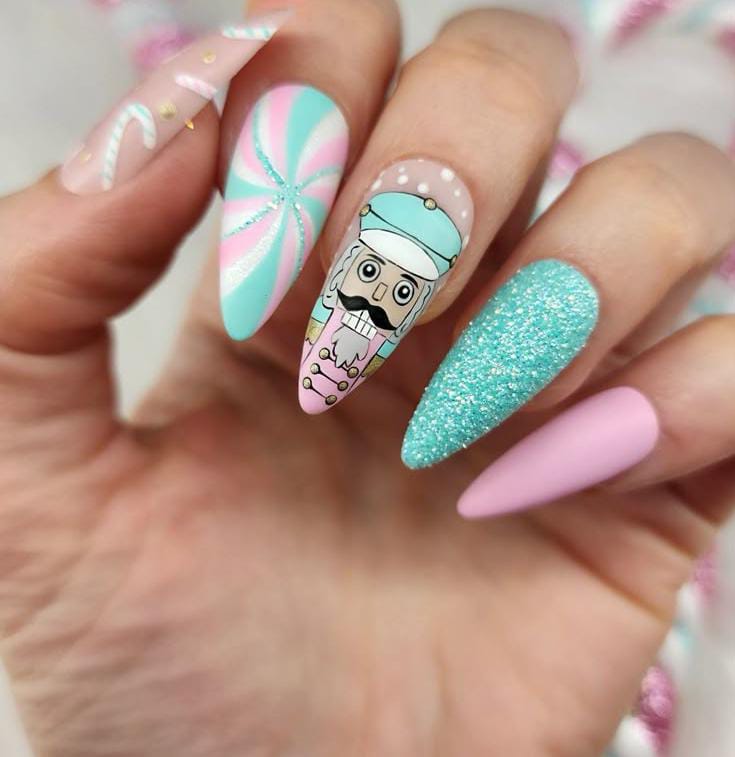 A sweet blend of mint, baby pink, and sparkly aqua with a cartoon-style nutcracker brings a fun, candy-coated twist to the traditional holiday theme.