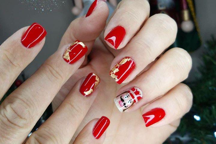 This design features bold, glossy red nails accented with touches of gold foil and a single Nutcracker accent nail, giving it a festive yet elegant holiday feel. The mix of shine and metallic details makes it look rich and traditional Christmas.