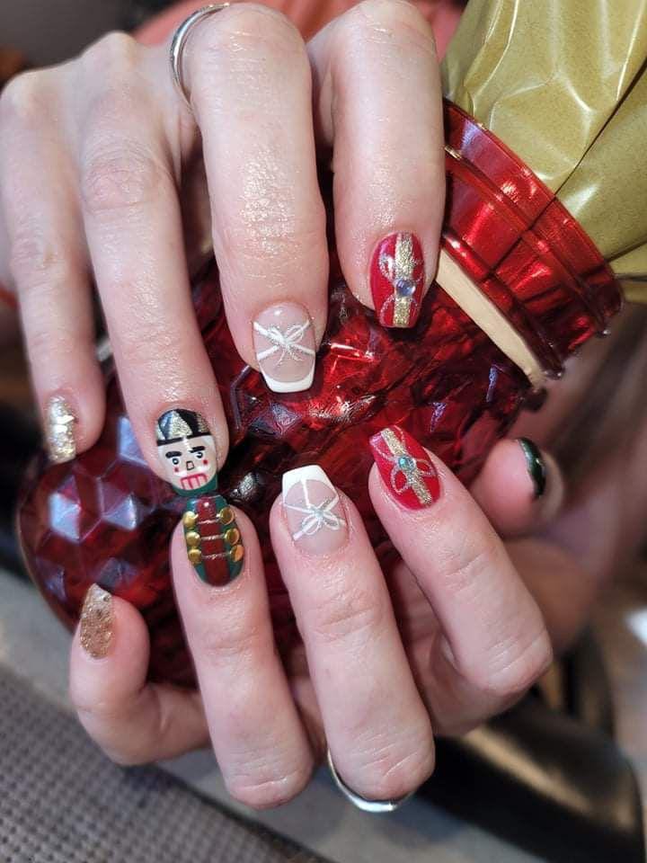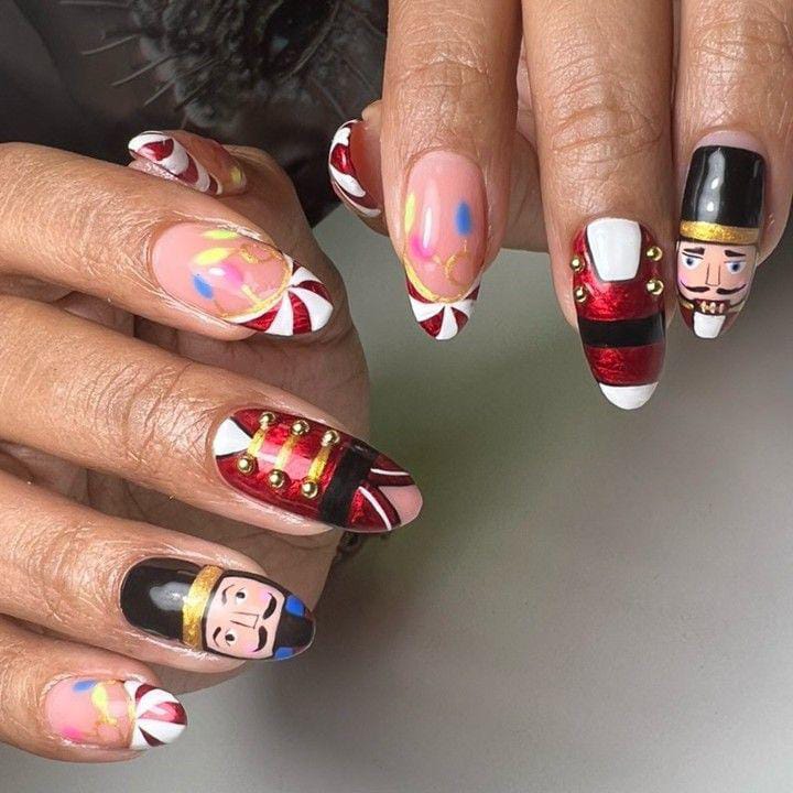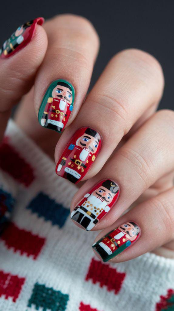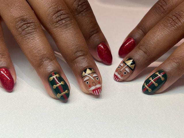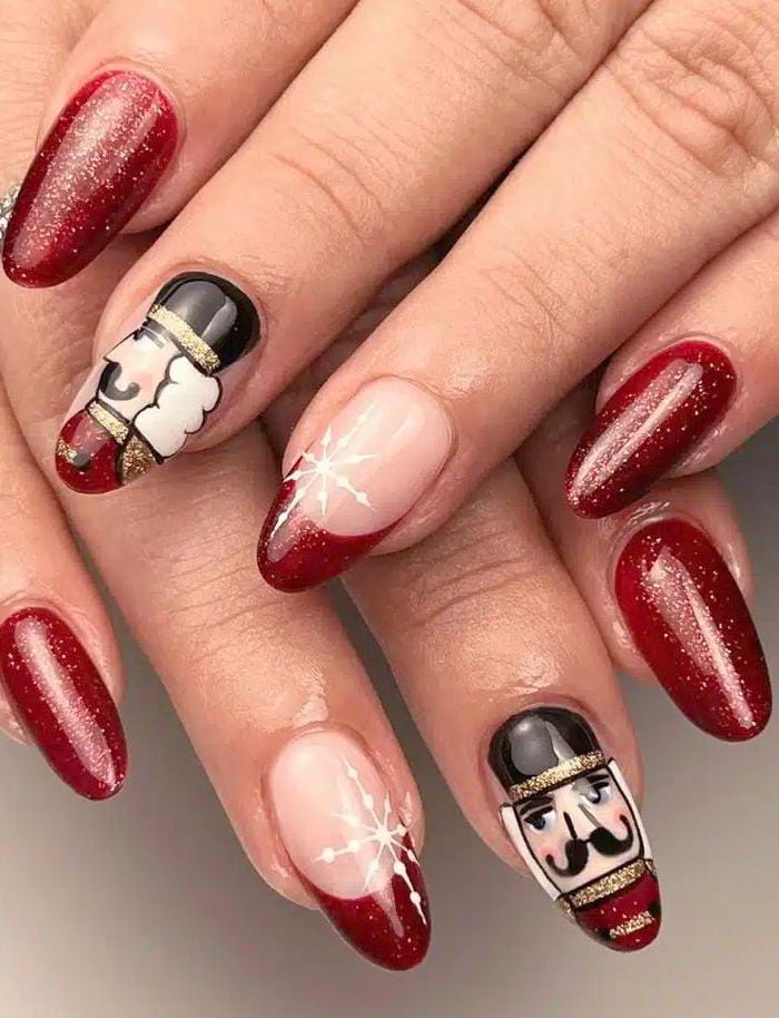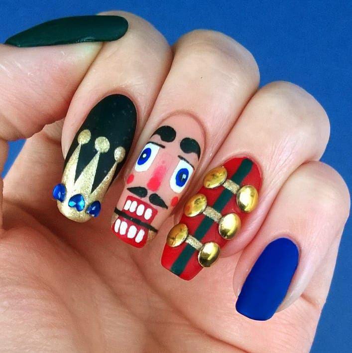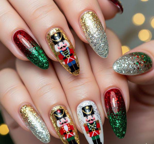 This design mixes deep green and shimmering red nails with playful Nutcracker faces, creating a bold and festive holiday look. The gold accents add a traditional, toy-soldier feel that instantly reads Christmas.