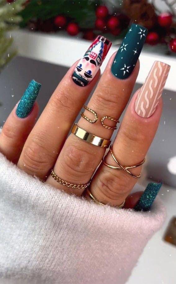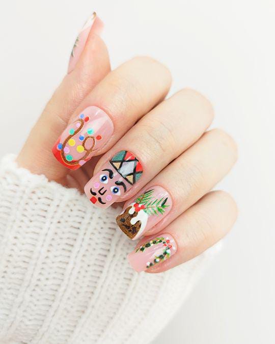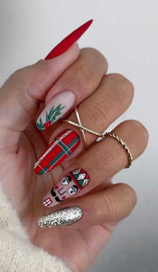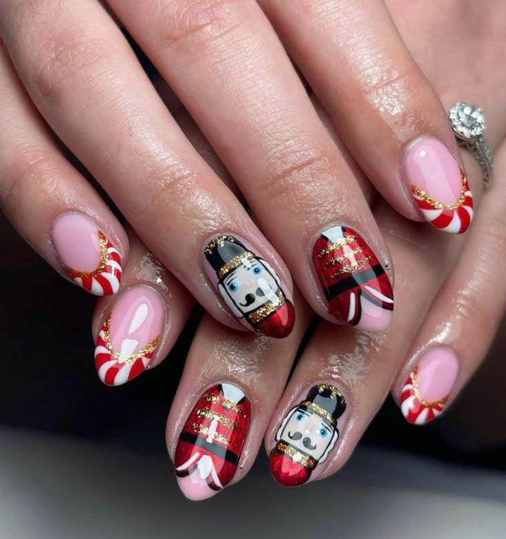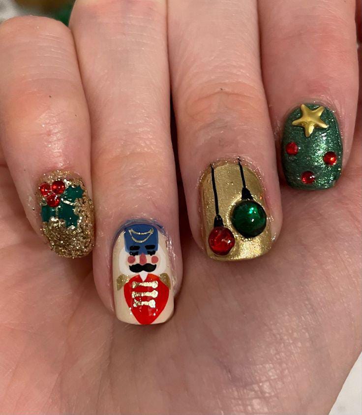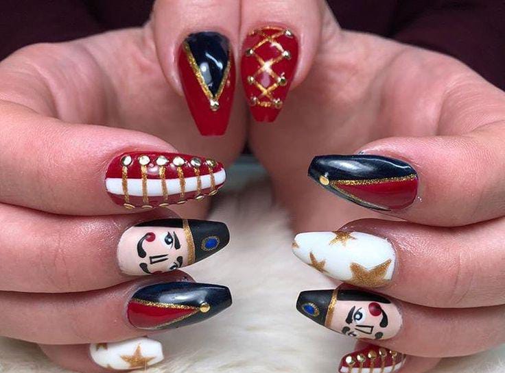 This design mixes deep green and shimmering red nails with playful Nutcracker faces, creating a bold and festive holiday look. The gold accents add a traditional, toy-soldier feel that instantly reads Christmas.