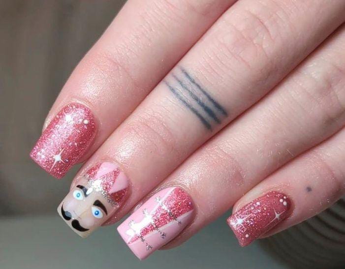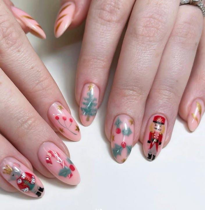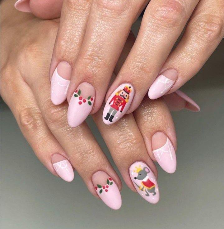 These soft blush-pink nails carry a sweet, whimsical vibe with simple Nutcracker and mouse characters paired with subtle berry and line details. The look is light, cute, and perfect for a softer take on holiday nail art.