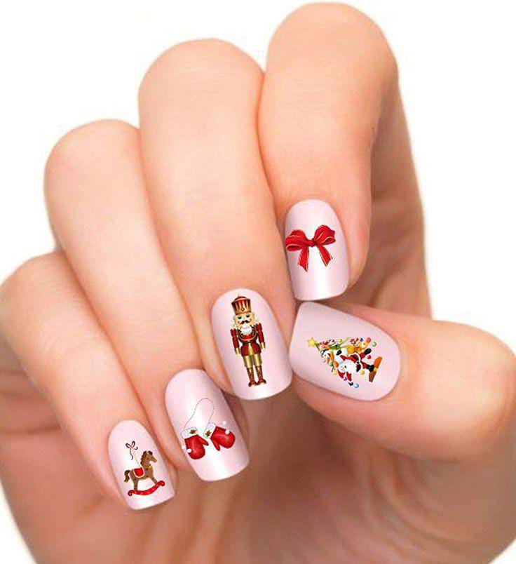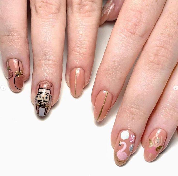 Soft nude nails decorated with tiny holiday icons—like gifts, angels, candy canes, and a small Nutcracker—give this set a sweet, storybook vibe. The overall look is delicate, playful, and perfect for a cozy Christmas mood.