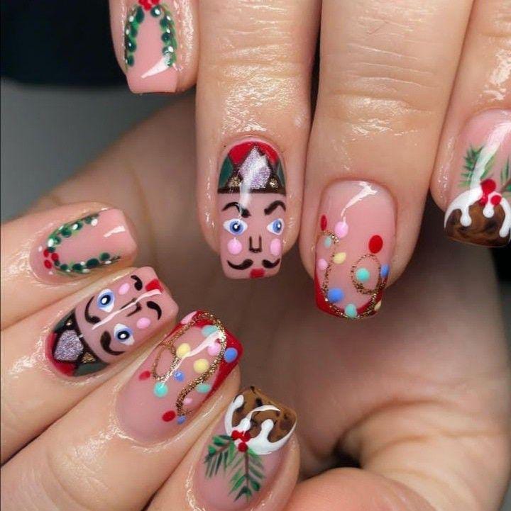 These nails feature a playful, cartoon-style Nutcracker face paired with colorful lights, holly, and holiday pudding motifs, giving the whole set a fun, childlike, and storybook-inspired Christmas vibe. It feels cheerful, bright, and full of personality.