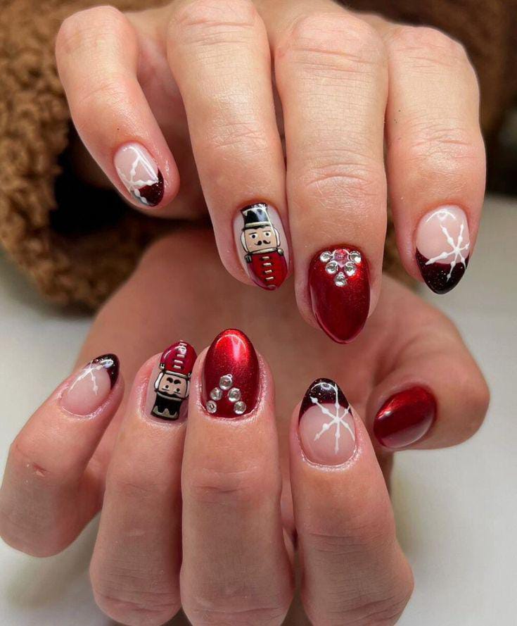 Deep, shimmering red nails are paired with bold Nutcracker art and crisp snowflakes, creating a dramatic and elegant festive and Christmas style.