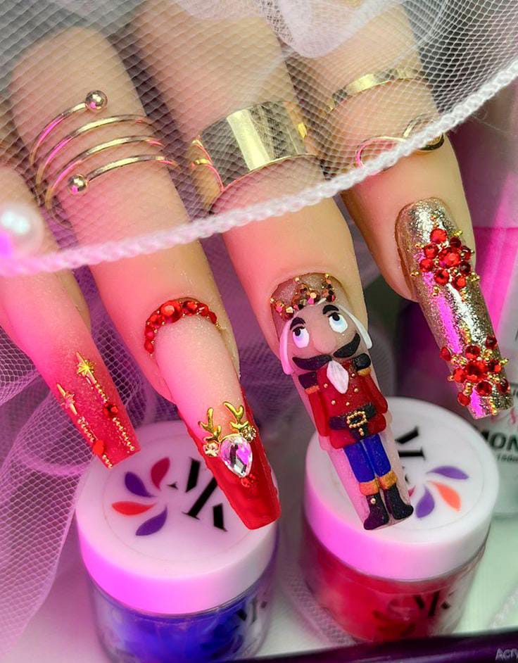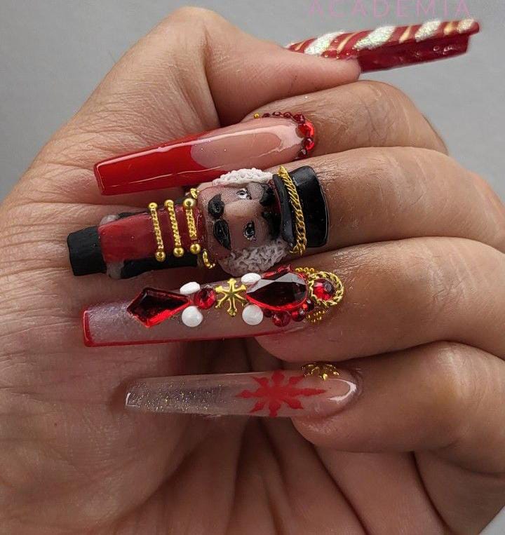 Long nails decorated with gold accents, red gems, and a sculpted nutcracker create an elegant, whimsical holiday style. The mix of sparkle and character art gives it a luxurious, fairytale-inspired look.