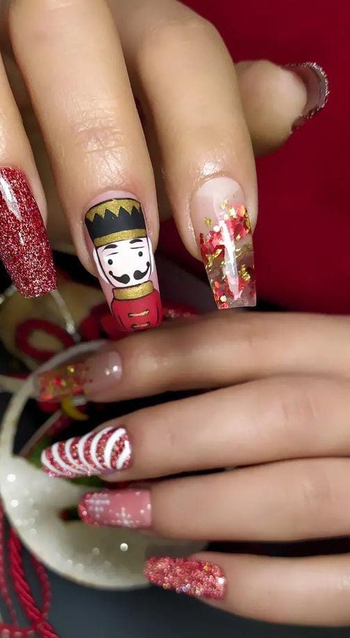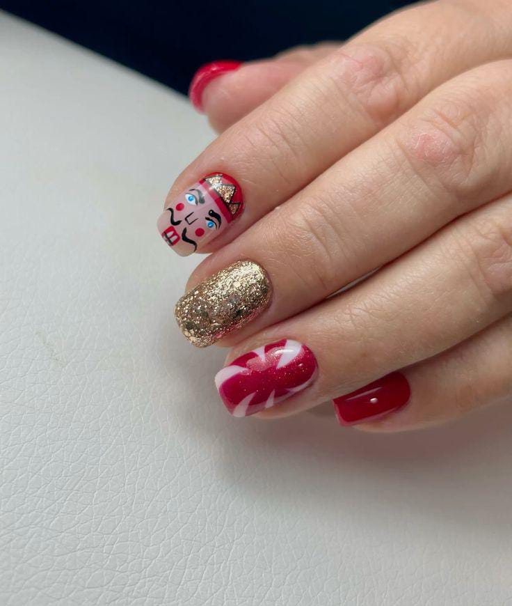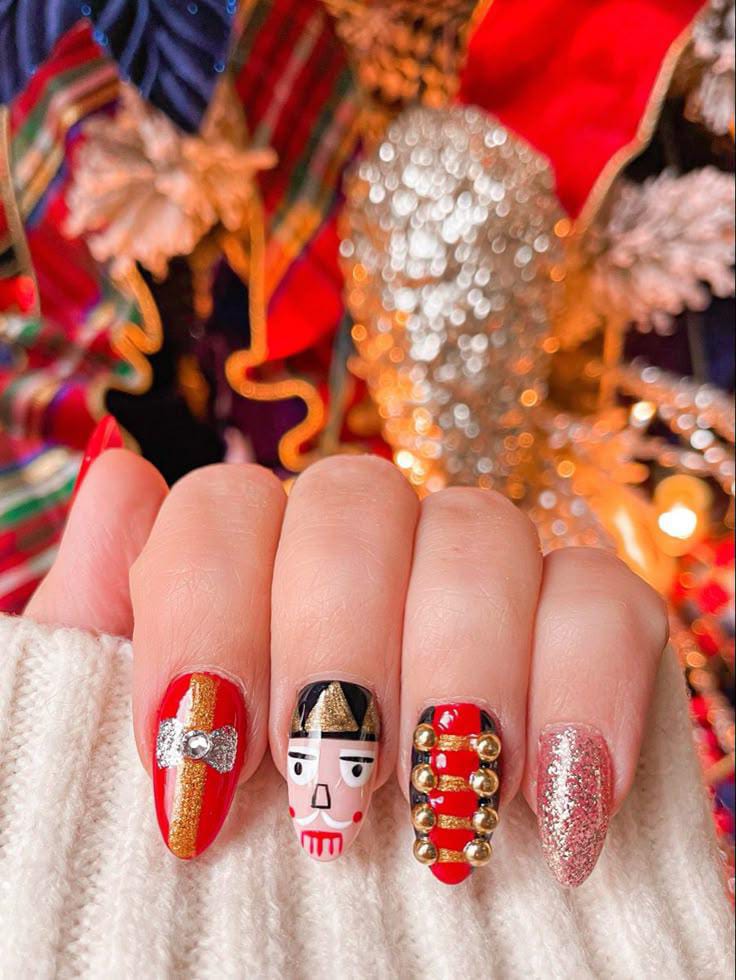 This design mixes bright red polish, peppermint design, gold glitter, and a playful Nutcracker face for a cheerful, festive look. The mix of bold color and sparkle gives it a warm Christmas holiday vibe.