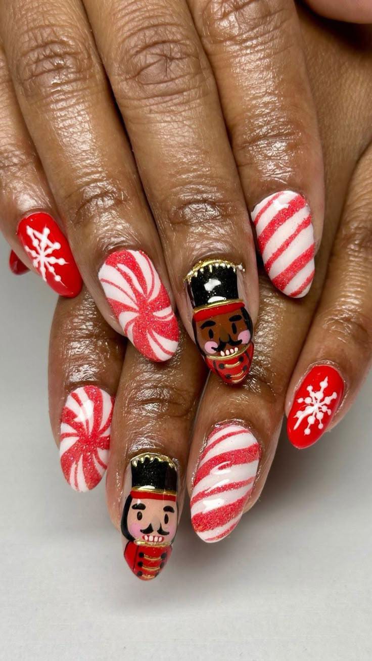 Red-and-white candy swirl nails mix with a gold-detailed Nutcracker accent for a bright, cheerful Christmas look full of classic holiday sweetness.
