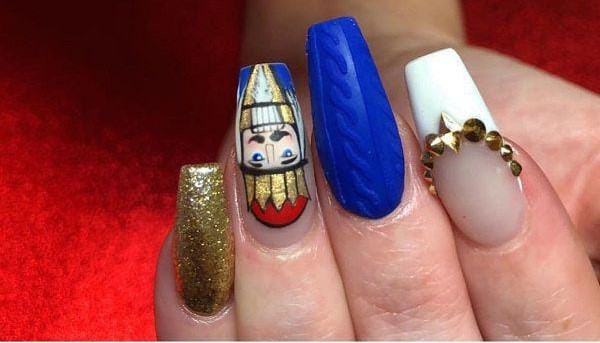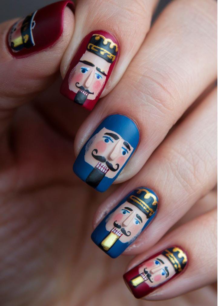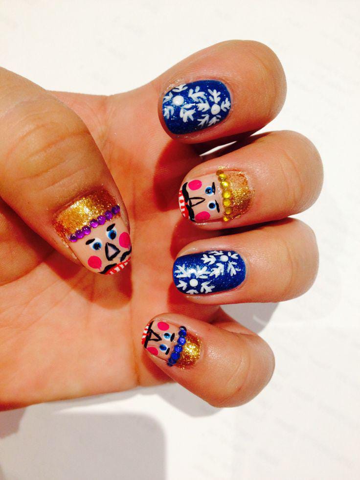 Bright colors, glittery accents, and cute Nutcracker faces combine with blue, snowflake nails for a fun, whimsical, toy-themed holiday and Christmas vibe.