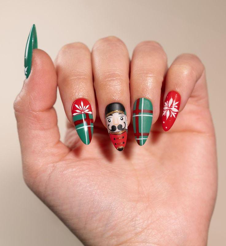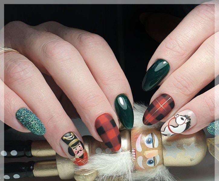 This look combines deep green nails, red-and-black plaid patterns, and cute character art for a warm, wintery vibe. It’s a balanced mix of rustic Christmas holiday charm and playful nutcracker details.