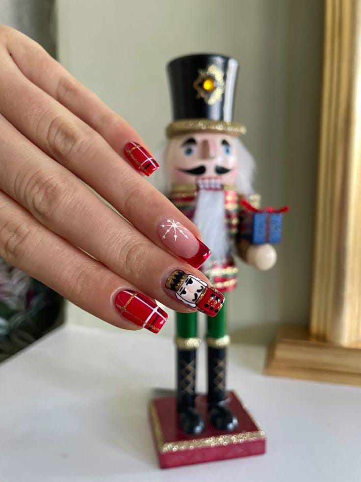 Bold red polish, clean line work, and a cute Nutcracker accent nail create a traditional, Christmas festive vibe. The snowflake and gift-wrap patterns make the whole set feel cheerful and classic.