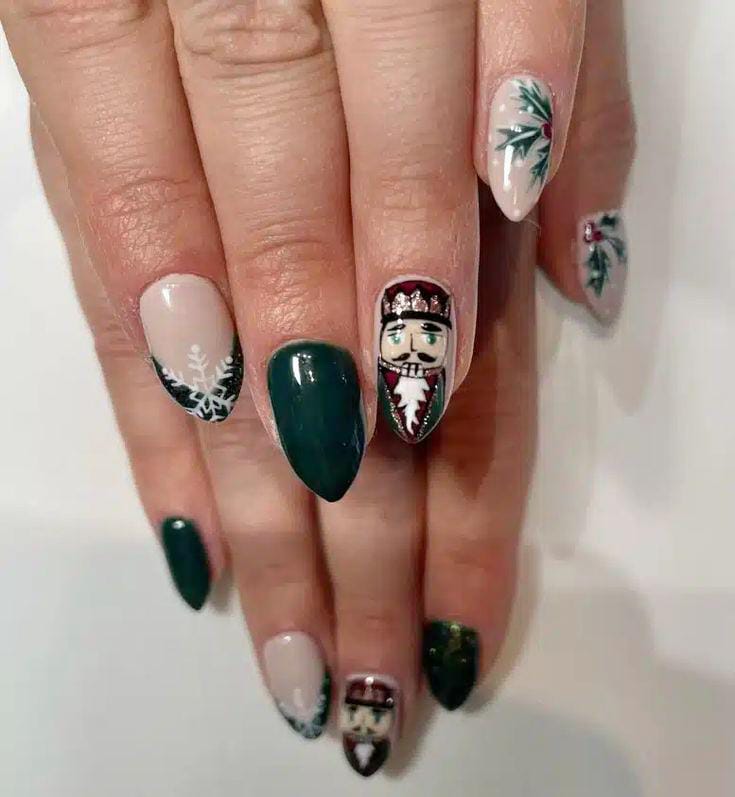 This design mixes deep green tones with soft nude shades, featuring snowflakes, winter foliage, and a detailed Nutcracker accent nail for a cozy, refined holiday look.