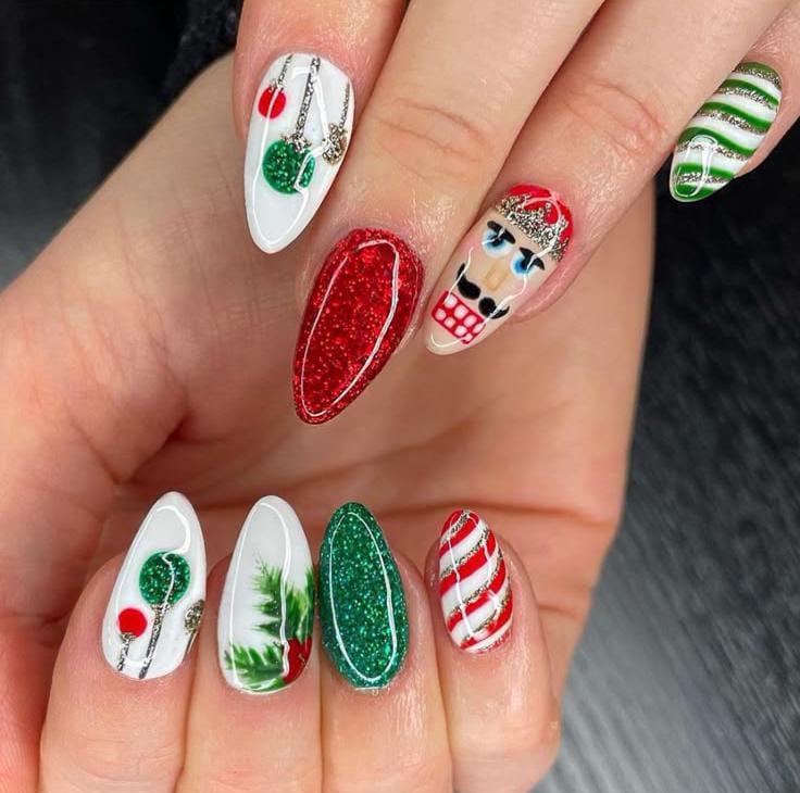 This design mixes bold red, green, and gold glitter with detailed Nutcracker art, giving the nails a festive and luxurious holiday feel. The combination of sparkle and character art creates a classic Christmas statement look.