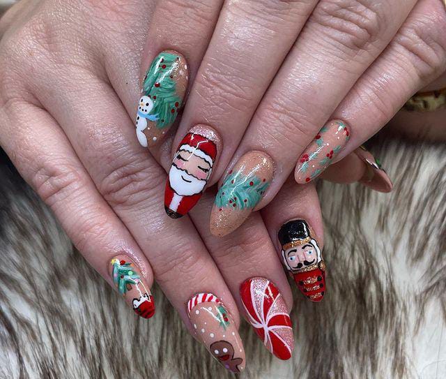 This design mixes warm holiday characters like Santa, snowmen, and a Nutcracker with glittery nude bases and pops of red and green, giving the whole set a cheerful, storybook Christmas vibe.