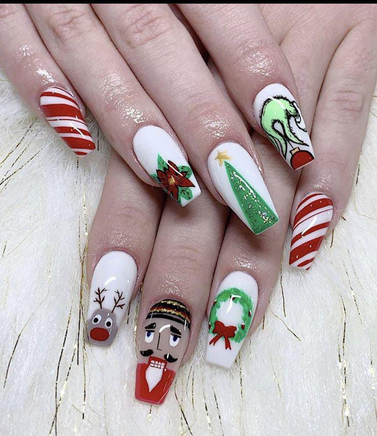 With crisp white bases, candy-cane stripes, bright greens, and playful character art including a Nutcracker and reindeer, this look feels bold, fun, and full of classic Christmas  holiday energy.