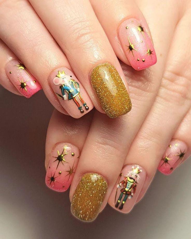 Soft pink fades paired with shimmering gold accents and tiny Nutcracker figures create a magical, dreamy holiday look with a slightly elegant twist.