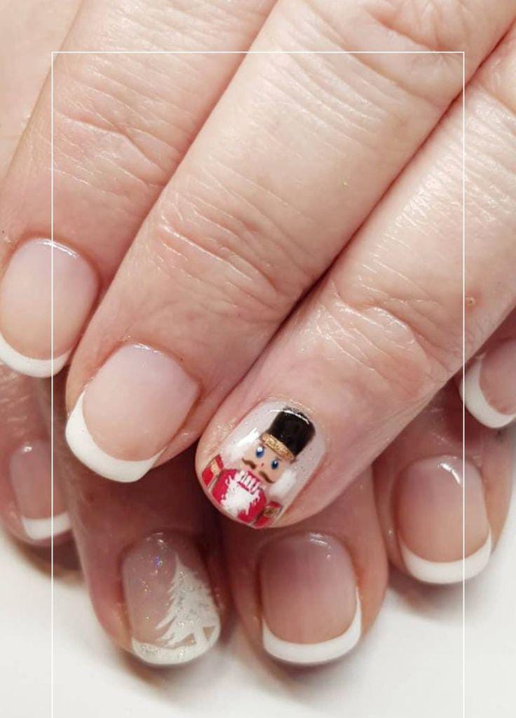 A clean French manicure gets a festive upgrade with a single Nutcracker accent and a snowy tree, keeping the overall style simple, neat, and subtly Christmas-themed.