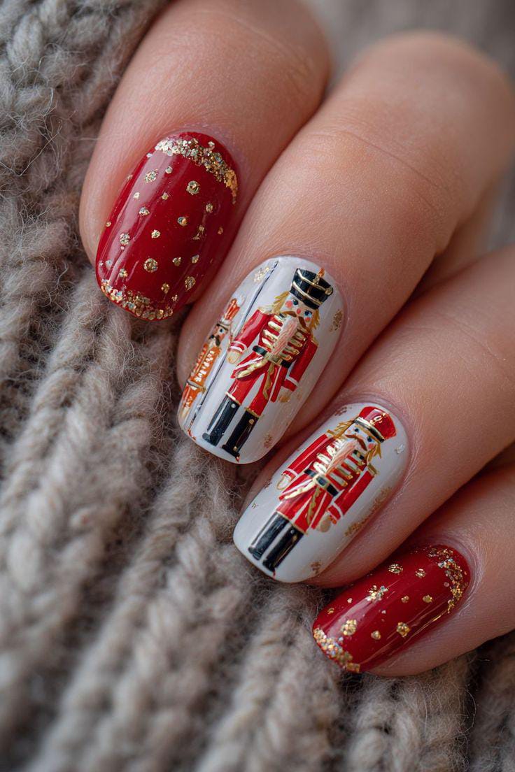 Rich red nails with gold glitter pair beautifully with detailed nutcracker soldiers on crisp white polish, giving the design an elegant, storybook-inspired feel.