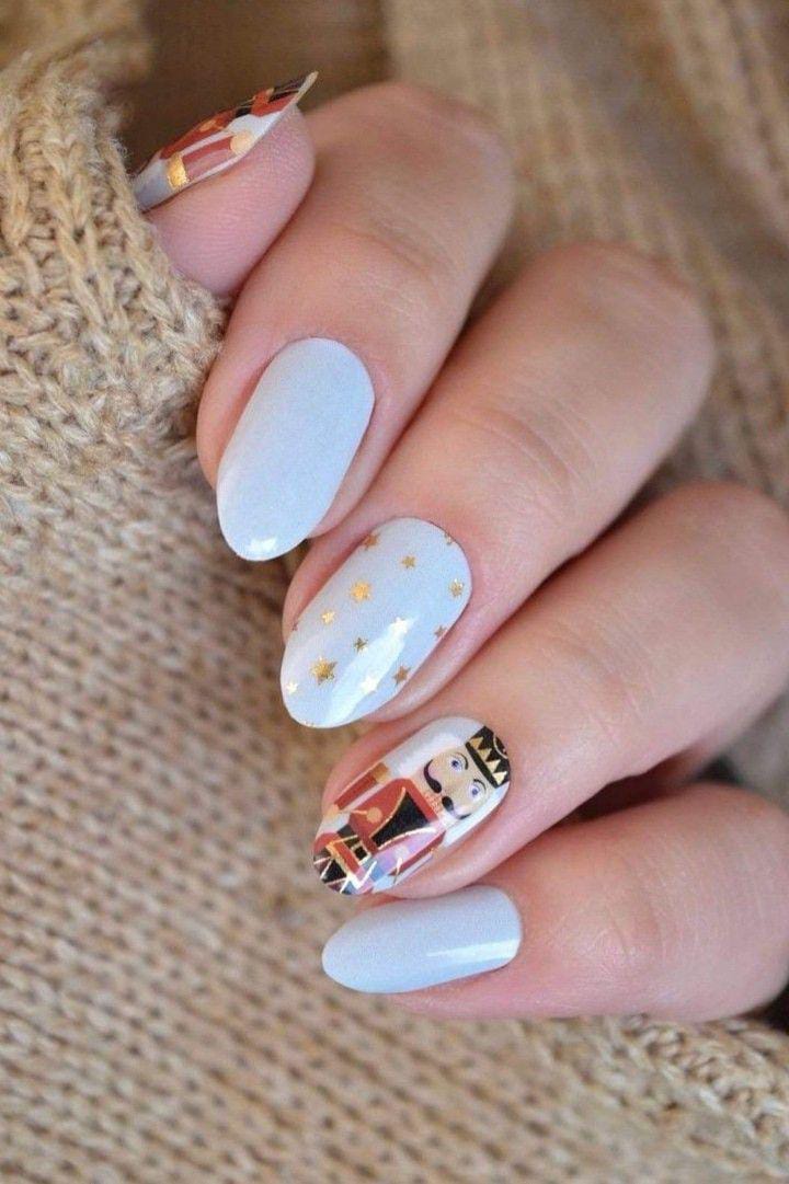 A delicate pastel base sets the stage for bright Nutcracker designs, festive tree, and a bold red bow, giving the manicure a cheerful, storybook feel. It’s playful, colorful, and great for a youthful Christmas look.