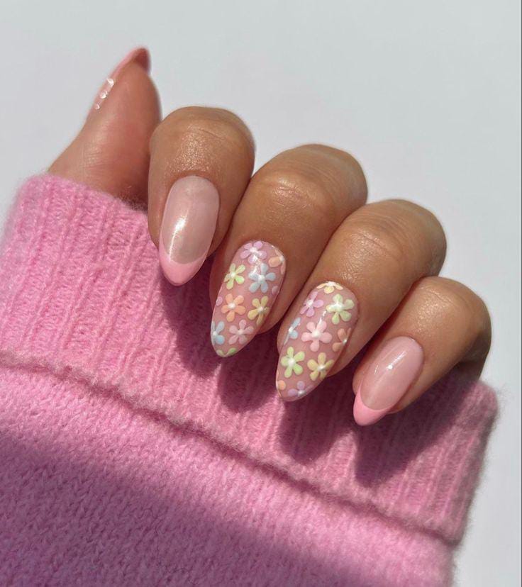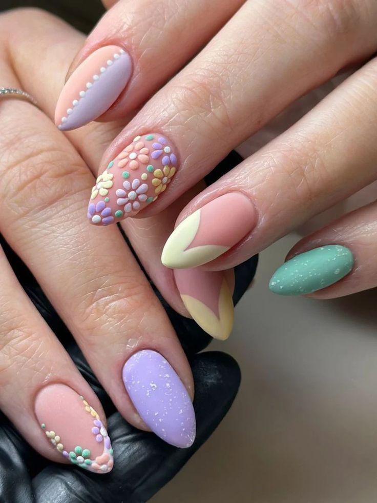 Soft pastel shades with tiny floral and french tip accents, creating a playful yet elegant spring look. The mix of colors feels fresh, cheerful, and light.