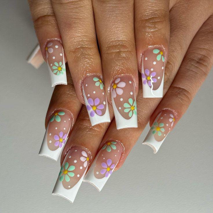 A light pink base with delicate pastel flowers creates a soft, romantic look. The french tips style is clean, feminine, and perfect for everyday spring wear.