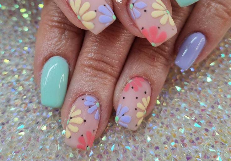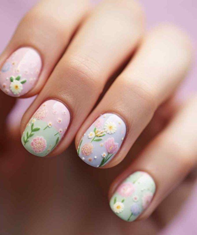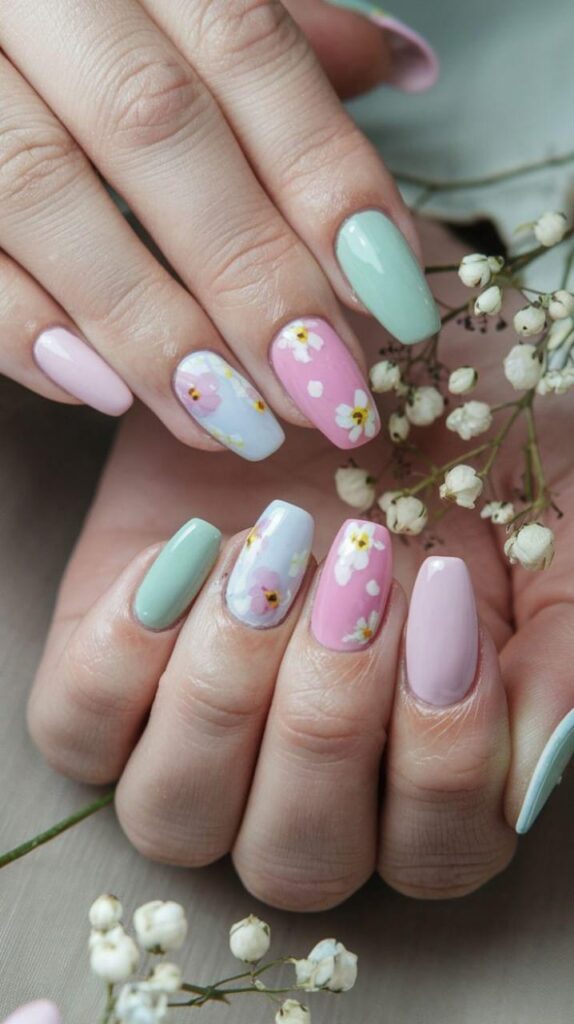 This design features soft pastel bases with tiny floral artwork for a fresh, springtime feel. The mix of pink, mint, and lavender creates a light and airy garden vibe.