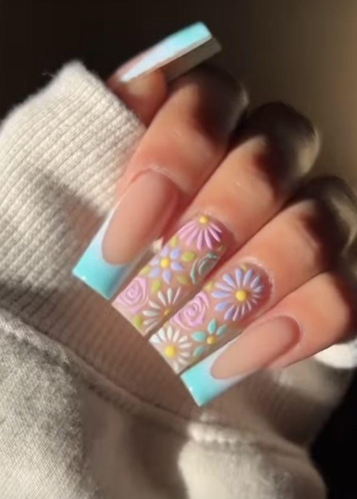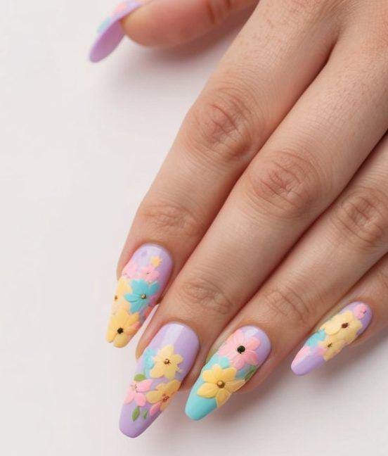 A mix of baby blue, lilac, and pink nails paired with raised pastel floral accents creates a playful spring garden feel. The look is fun, textured, and slightly bold while staying pastel.
