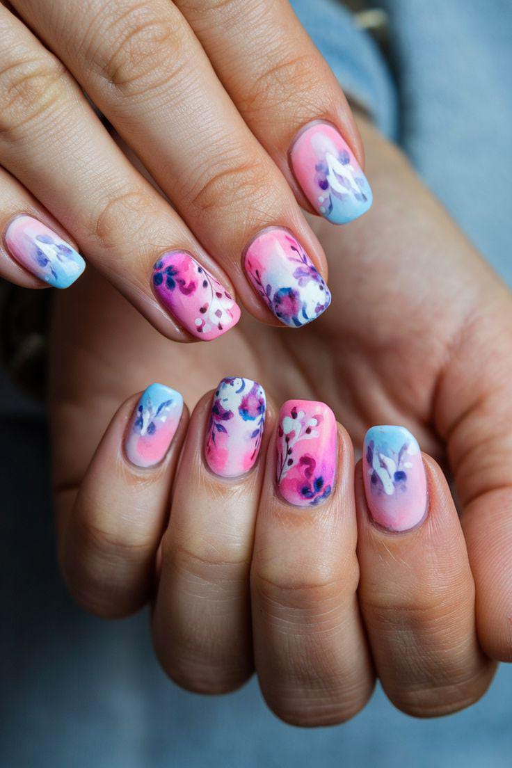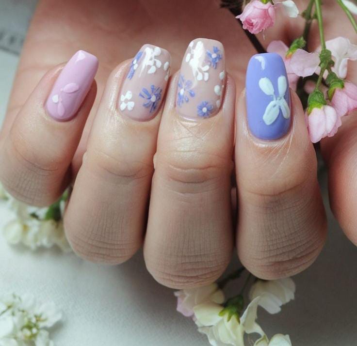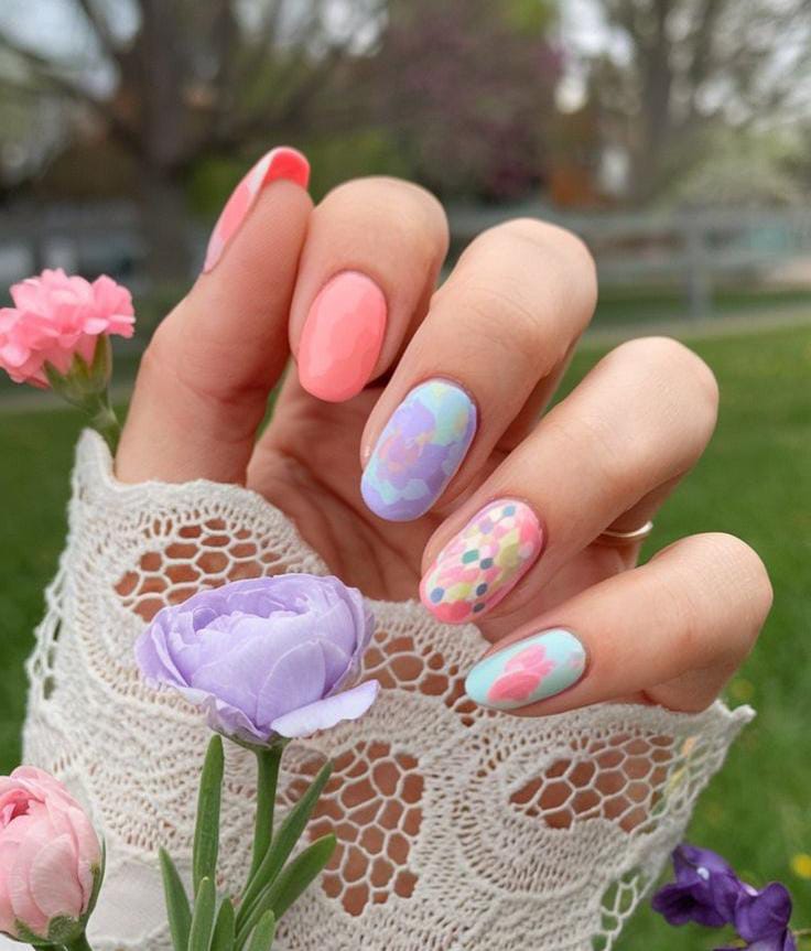 This design mixes peach and lavender bases with hand-painted pastel flowers for a gentle spring feel. The overall look is light, fresh, and artistic without feeling too bold.