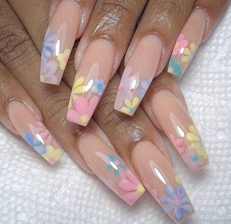 Clear and nude bases are decorated with pastel flowers and soft blue tips for a clean spring look. It feels fresh, bright, and slightly whimsical without being too bold.