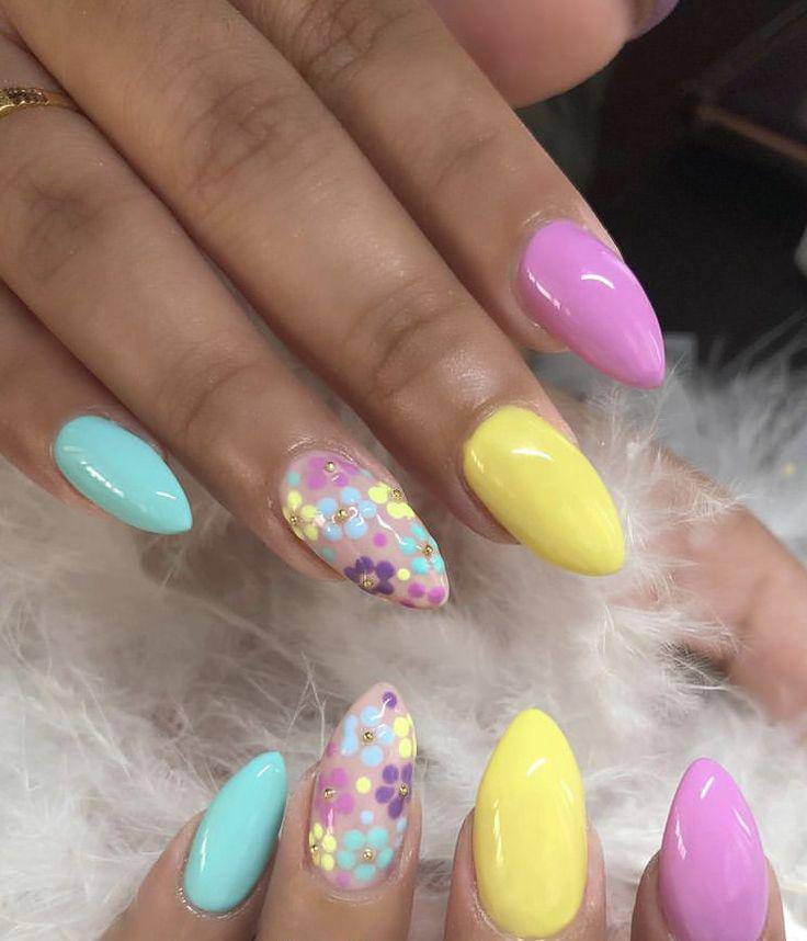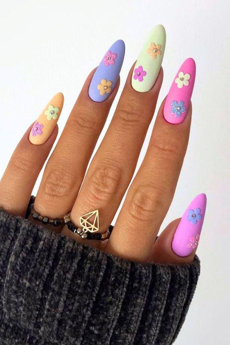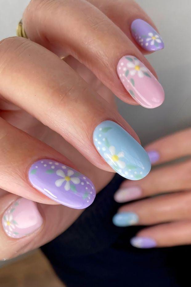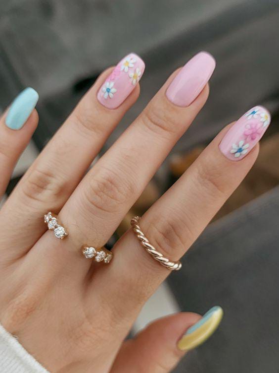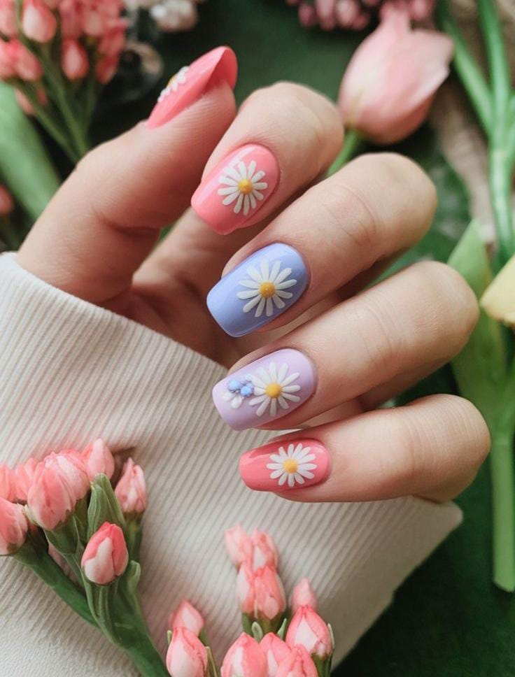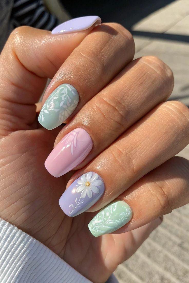 Each nail is painted in a different pastel shade, creating a clean yet fun color-block effect. The tiny floral detail adds a gentle, nature-inspired spring touch.