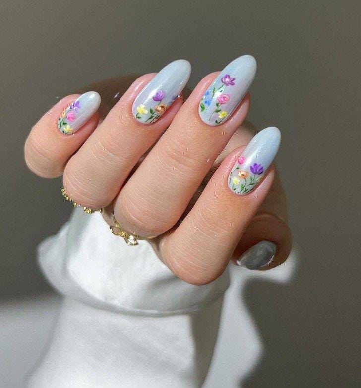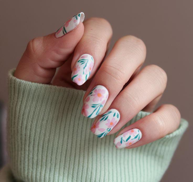 This design features a milky pastel base with delicate hand-painted flowers scattered across the nails. The overall vibe is fresh, airy, and very spring-inspired.