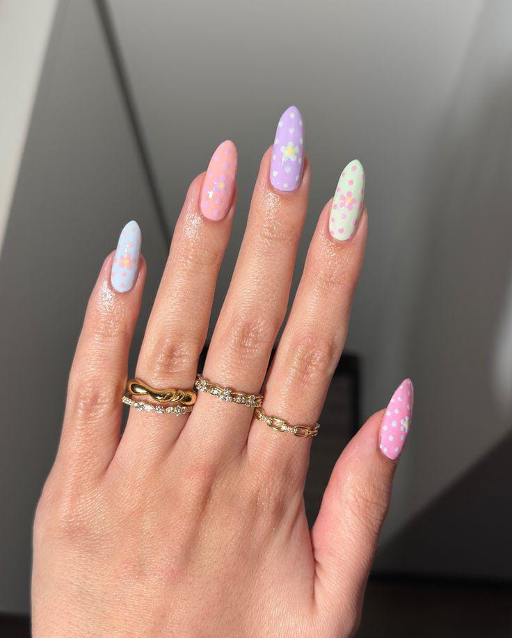 Each nail showcases a different pastel shade with gentle dotted patterns. The look is playful, modern, and perfect for spring.