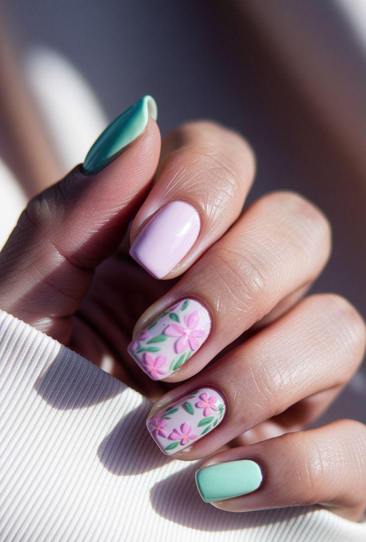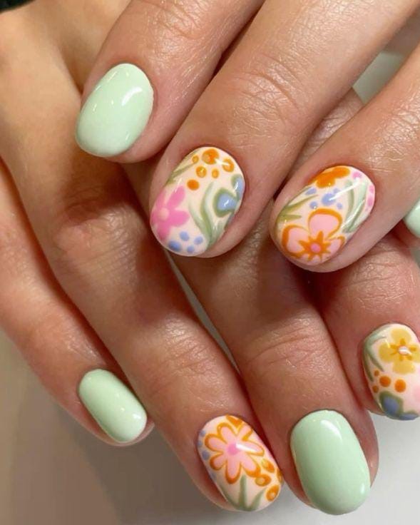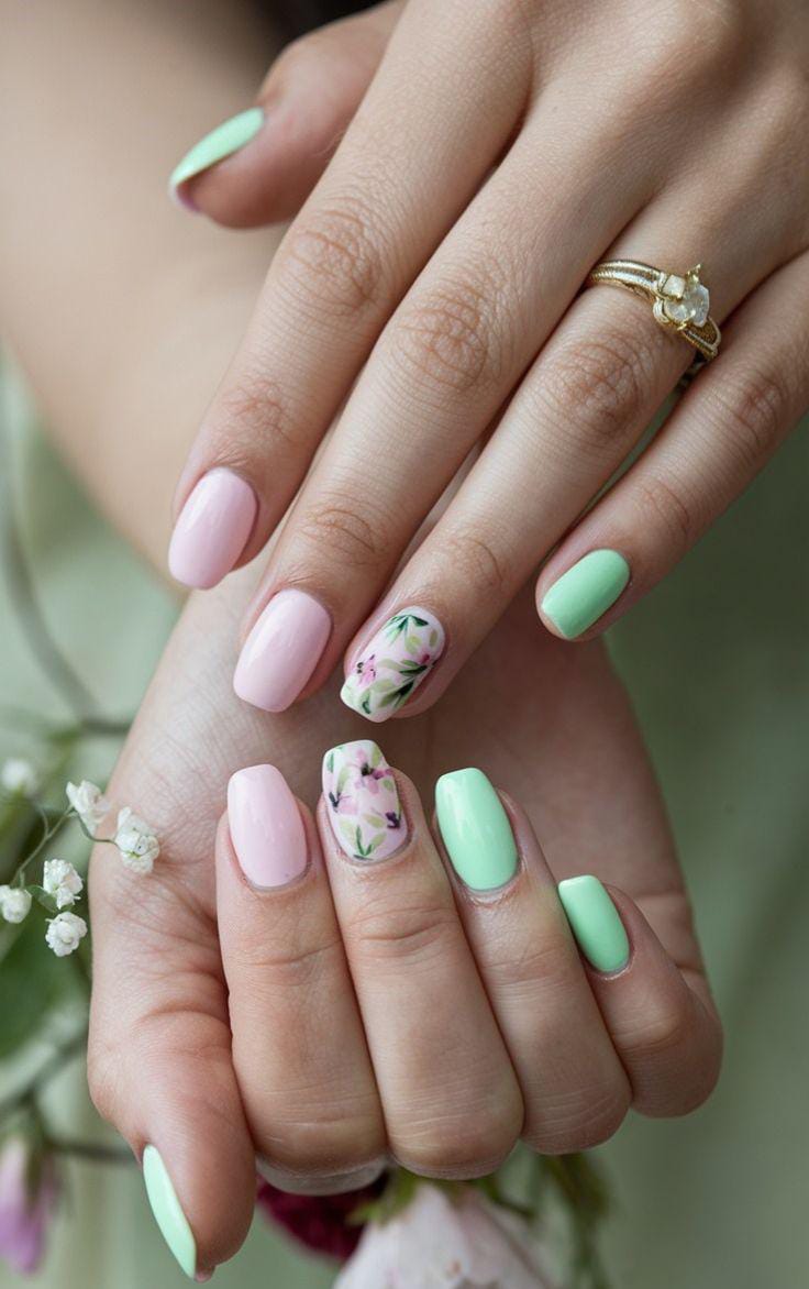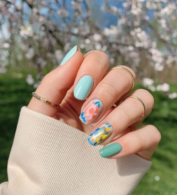 This design combines mint green nails with hand-painted floral patterns in warm pastel tones. It feels artsy, cheerful, and inspired by spring flowers in bloom.