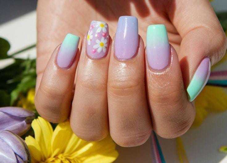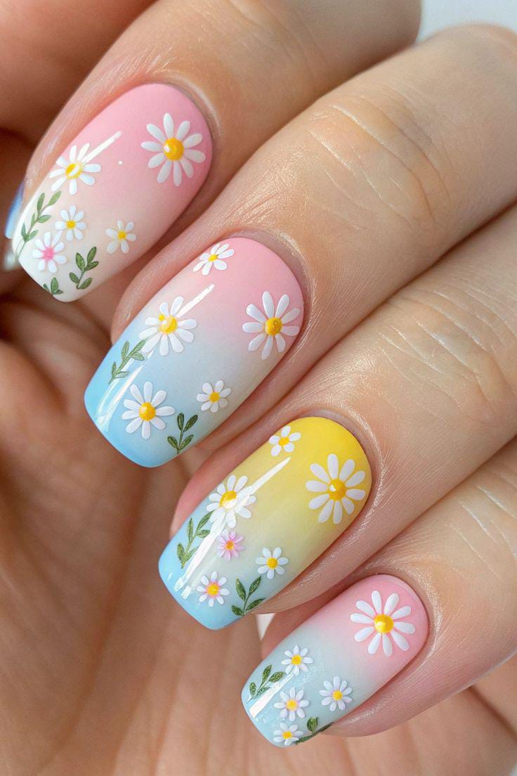 Soft pastel ombré tones are decorated with tiny white daisy flowers. The design feels dreamy, feminine, and effortlessly pretty spring look.