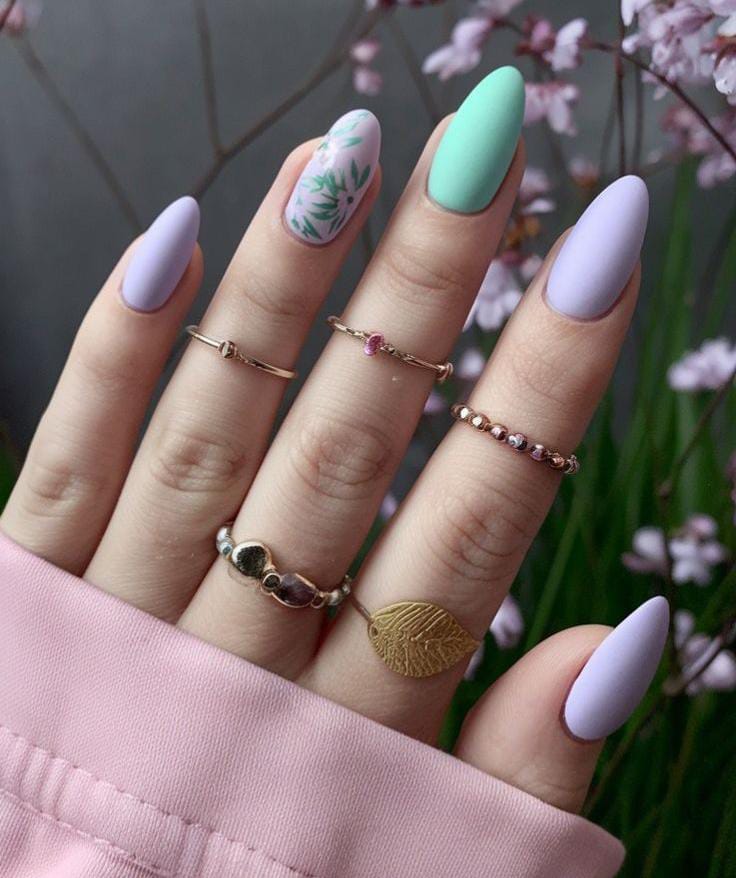 A gentle mix of mint green and lilac pastel creates a fresh spring feel, paired with a delicate leafy accent nail. The look is clean, airy, and effortlessly elegant.