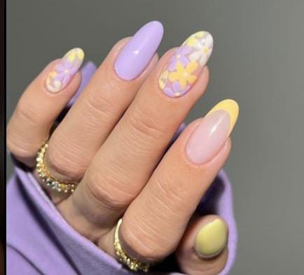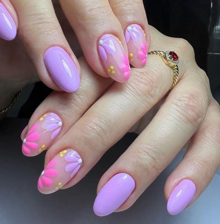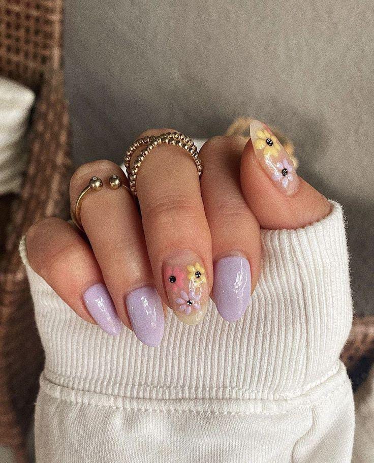 Pastel lavender nails with colorful floral designs give this set a lively spring meadow vibe. It feels bright, youthful, and perfect for the spring season.