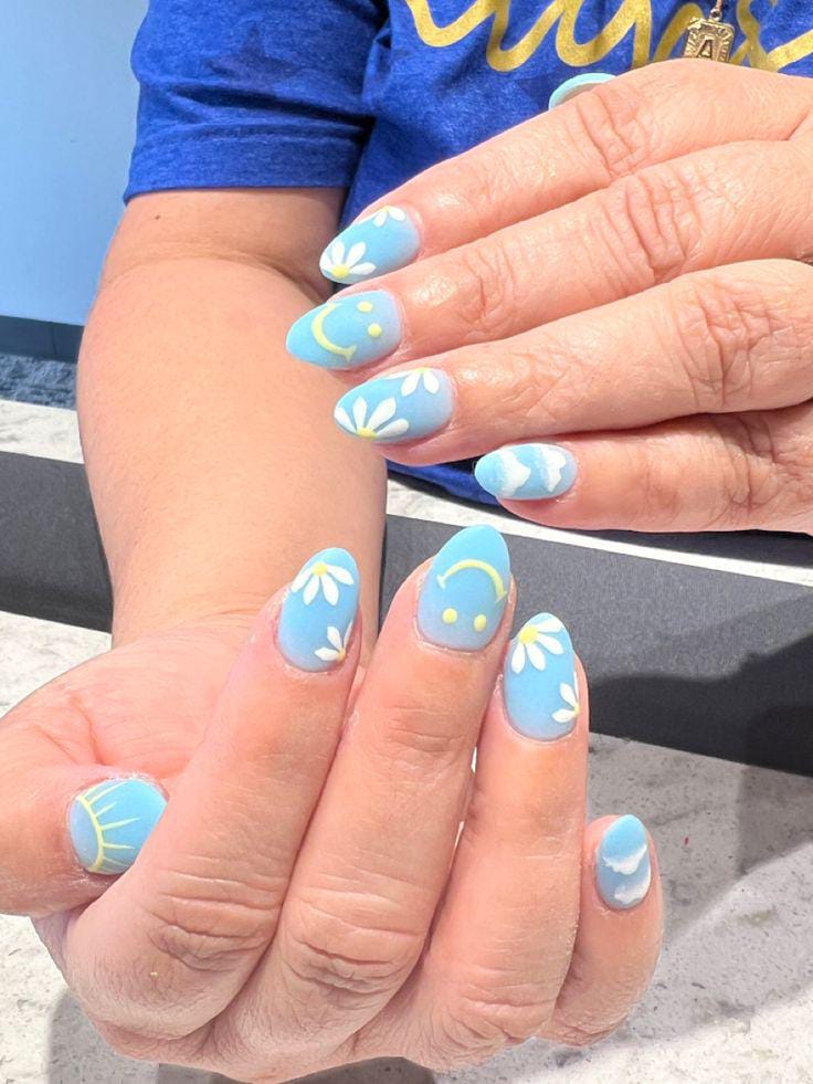 Light blue pastel nails feature simple daisies and cute smiley accents for a fun, youthful feel. The design gives off a relaxed, happy, springtime energy.
