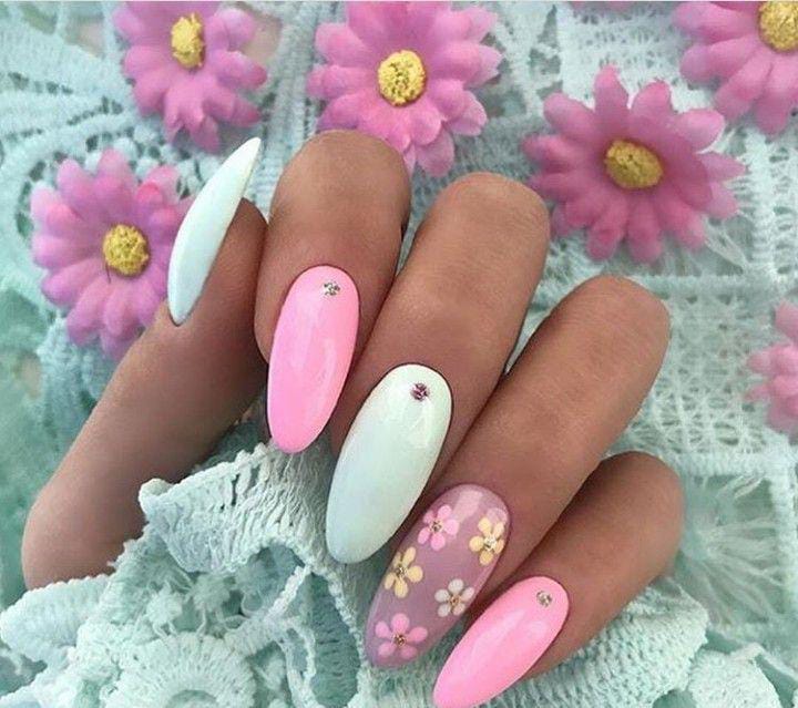 Pastel pink and milky white nails blend beautifully with subtle floral patterns. This design feels romantic, soft, and perfect for springtime.