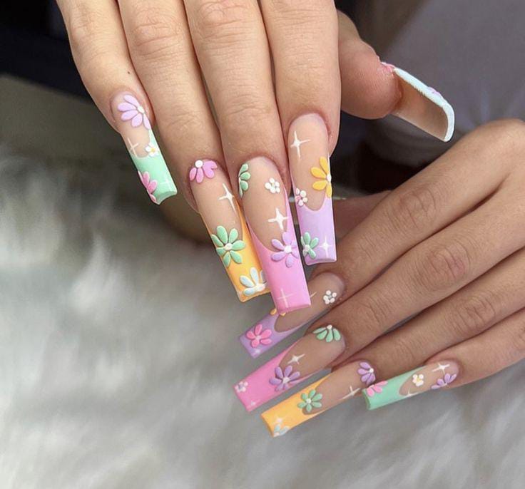 This set features a playful mix of pastel shades like pink, mint, and yellow french tips with cute raised floral patterns. The vibe is cheerful, fun, and full of spring energy.