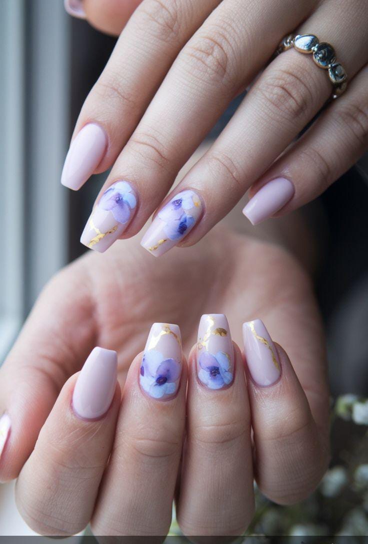 A soft blush base is combined with delicate pastel purple flowers and light gold accents. The design feels classy and feminine with a subtle touch of luxury spring aesthetic.