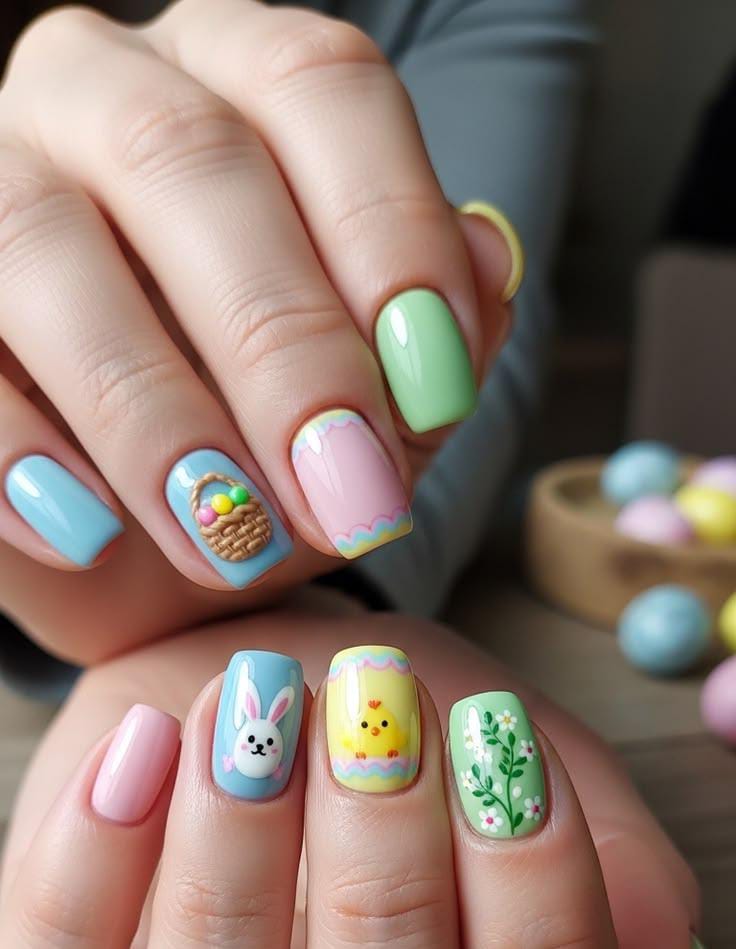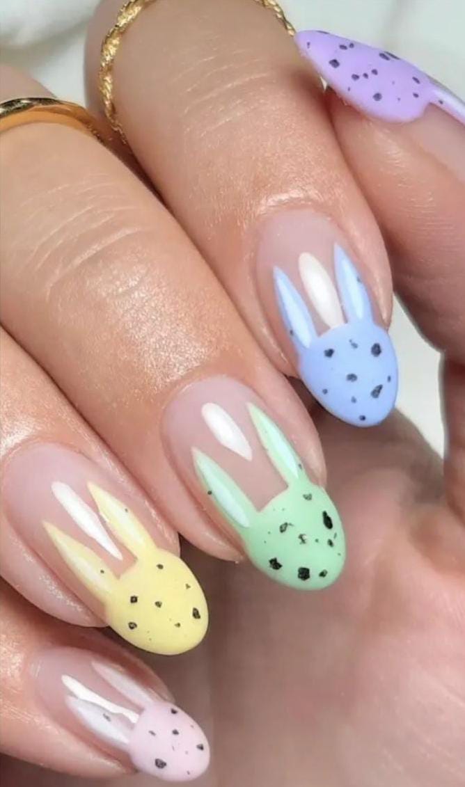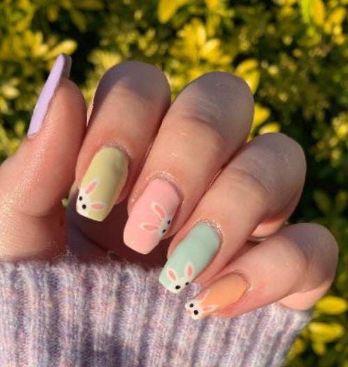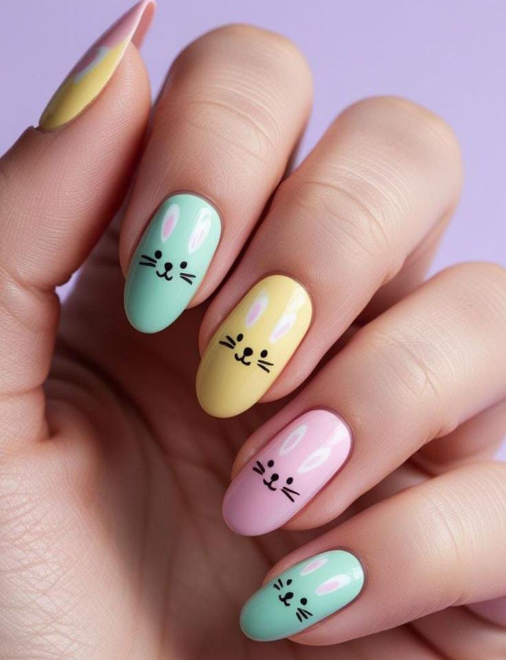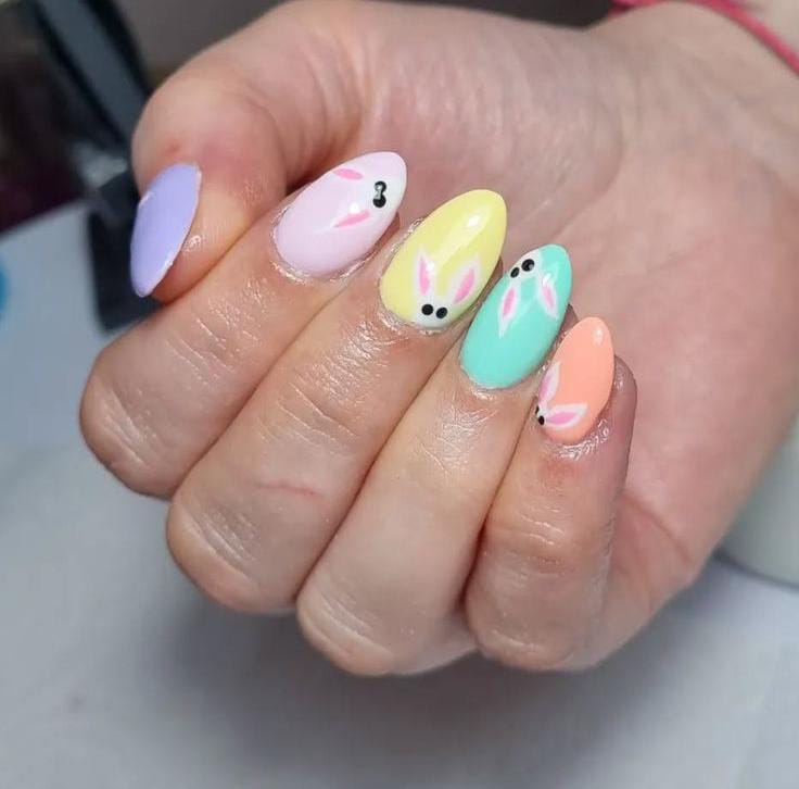 Soft pastel shades like yellow, blue, peach, and pink create a gentle spring palette across the nails. Tiny bunny faces and ears add a cute Easter touch that makes the design playful and festive.