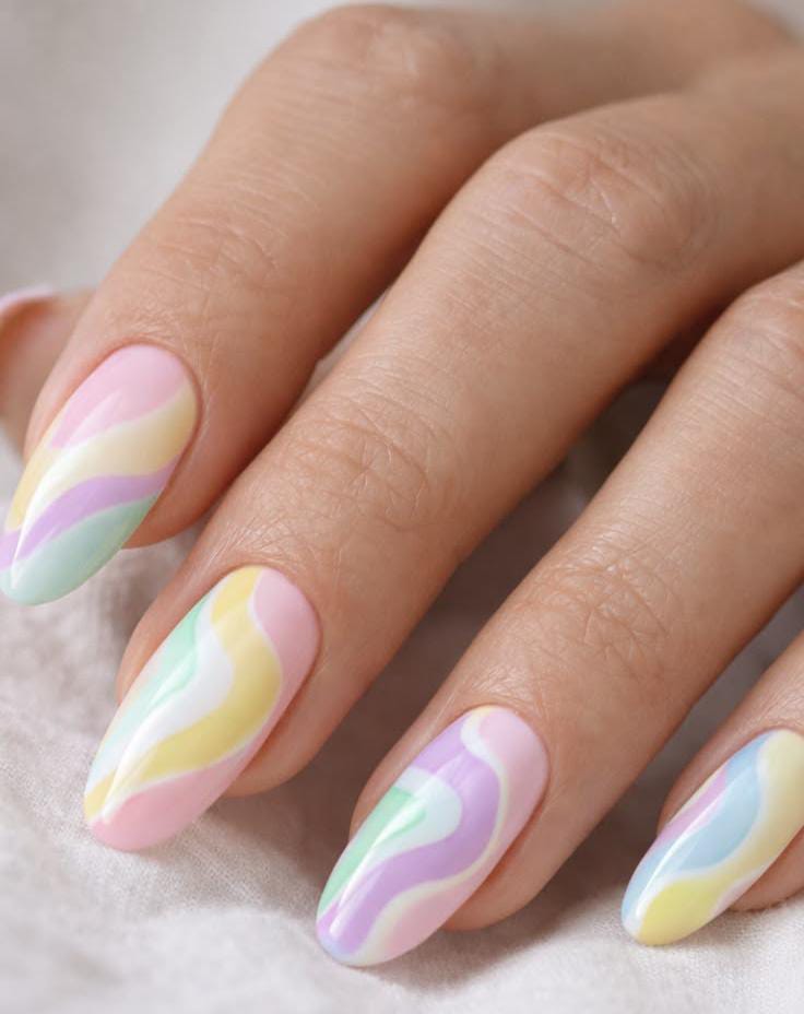 Soft pastel swirls in yellow, mint, lavender, yellow and baby pink flow across almond-shaped nails, creating a dreamy Easter vibe. The glossy finish and smooth curves give the design a light, playful, springtime feel.