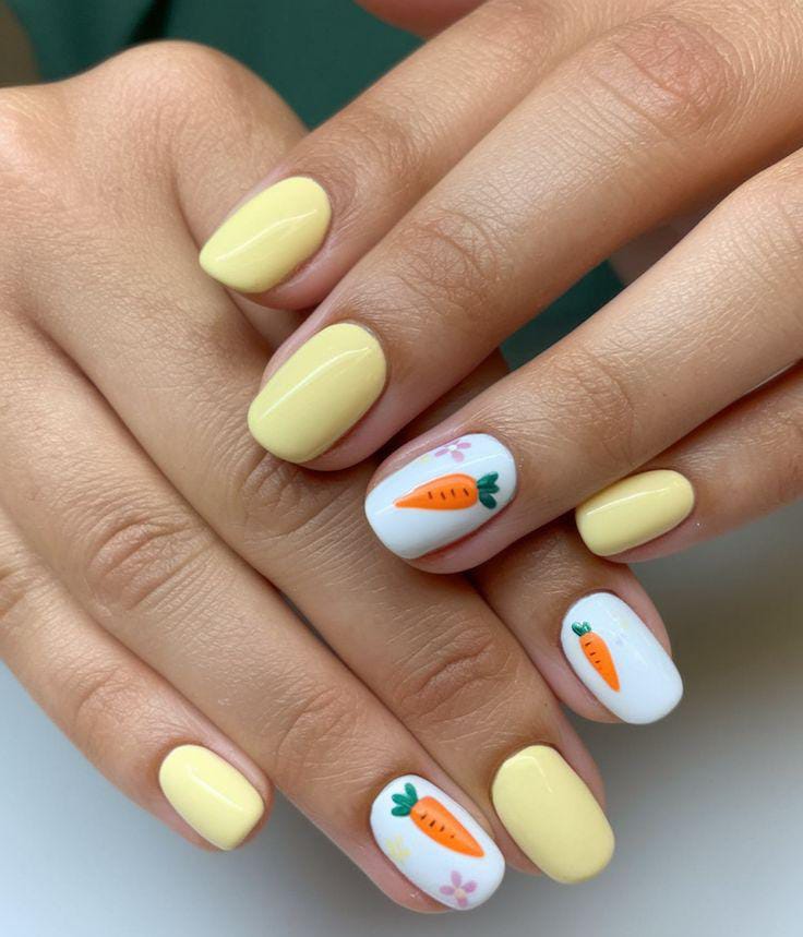 Soft pastel yellow nails are paired with white accent nails decorated with tiny hand-painted carrots. The design feels cheerful, fresh, and perfectly themed for a fun Easter manicure.