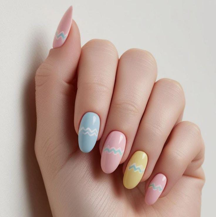 Pastel blue, pink, and yellow nails are decorated with simple zigzag lines inspired by classic Easter eggs. The soft colors and minimal pattern give the manicure a clean and festive spring vibe.