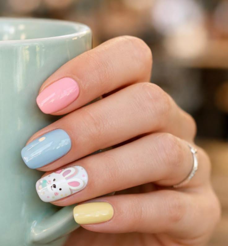 Soft pastel pink, blue, and yellow nails create a gentle spring palette with a cute bunny accent nail. The glossy finish and simple design give the manicure a sweet and cozy Easter vibe.