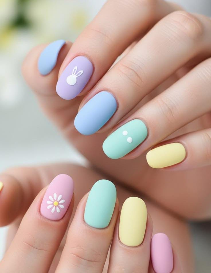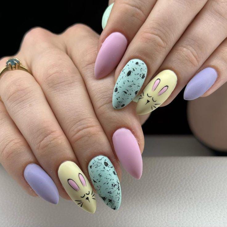 Matte pastel lilac, yellow, and blue nails are paired with speckled egg-style accents and tiny bunny faces. The mix of soft colors and playful details creates a charming Easter-inspired look.