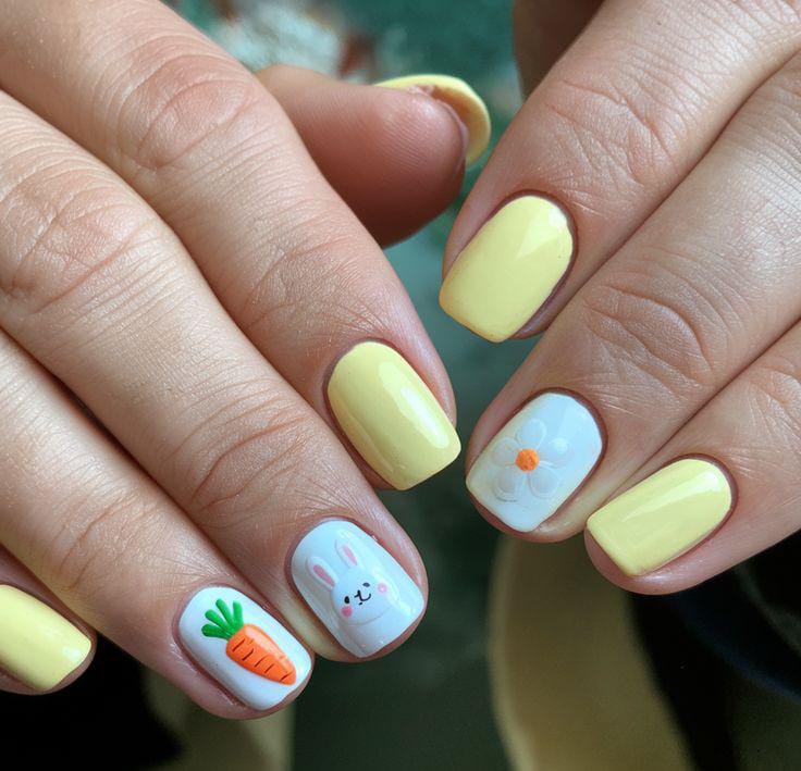 Soft pastel yellow nails create a fresh spring look, while cute bunny and carrot accents add a playful Easter vibe. The design feels light, cheerful, and perfect for a fun seasonal manicure.