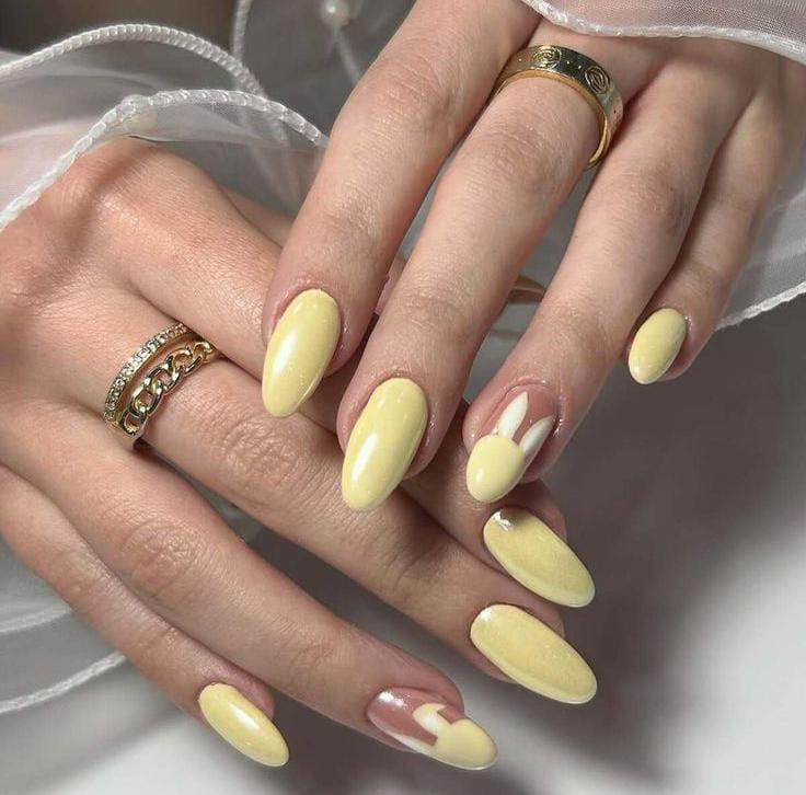 Glossy pastel yellow almond nails give a clean and elegant spring style. A subtle bunny accent nail adds a delicate Easter touch while keeping the overall design simple and chic.