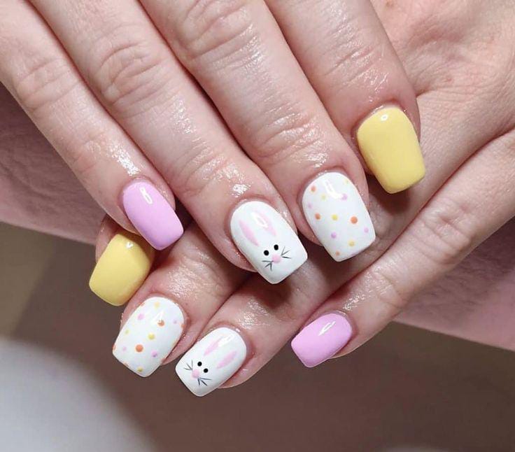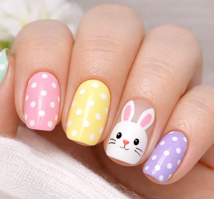 Soft pastel nails in pink, yellow, and lavender are decorated with playful white polka dots and a cute bunny accent. The design feels cheerful, colorful, and perfectly inspired by fun Easter treats.