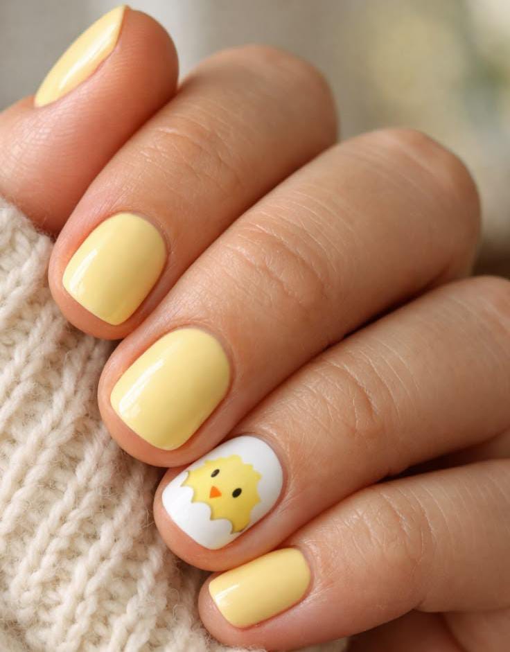 Glossy pastel yellow nails are paired with a sweet baby chick design hatching from an egg. The simple style gives a soft, adorable Easter vibe with a warm spring feel.